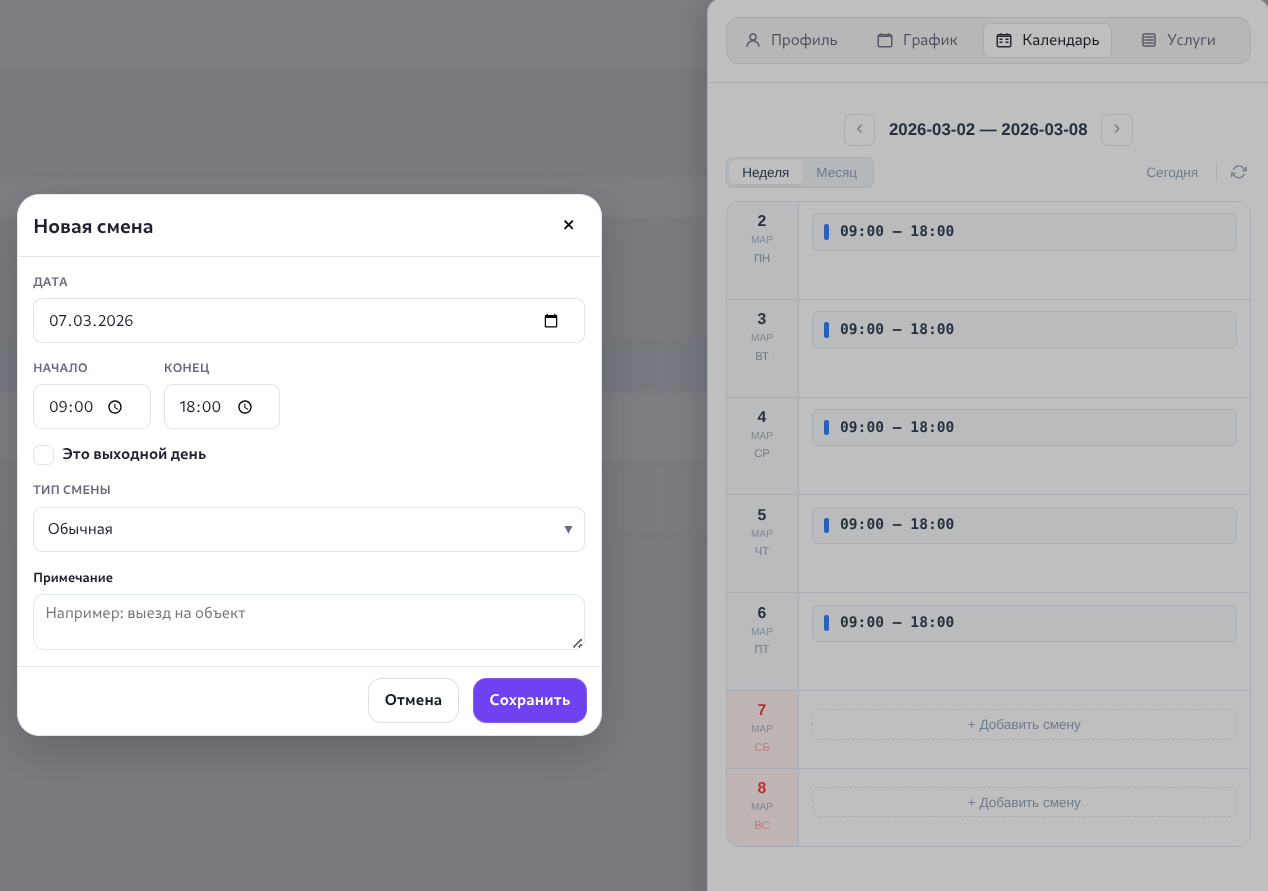 Календарь — это дополнительные смены, перерывы и разовые исключения.