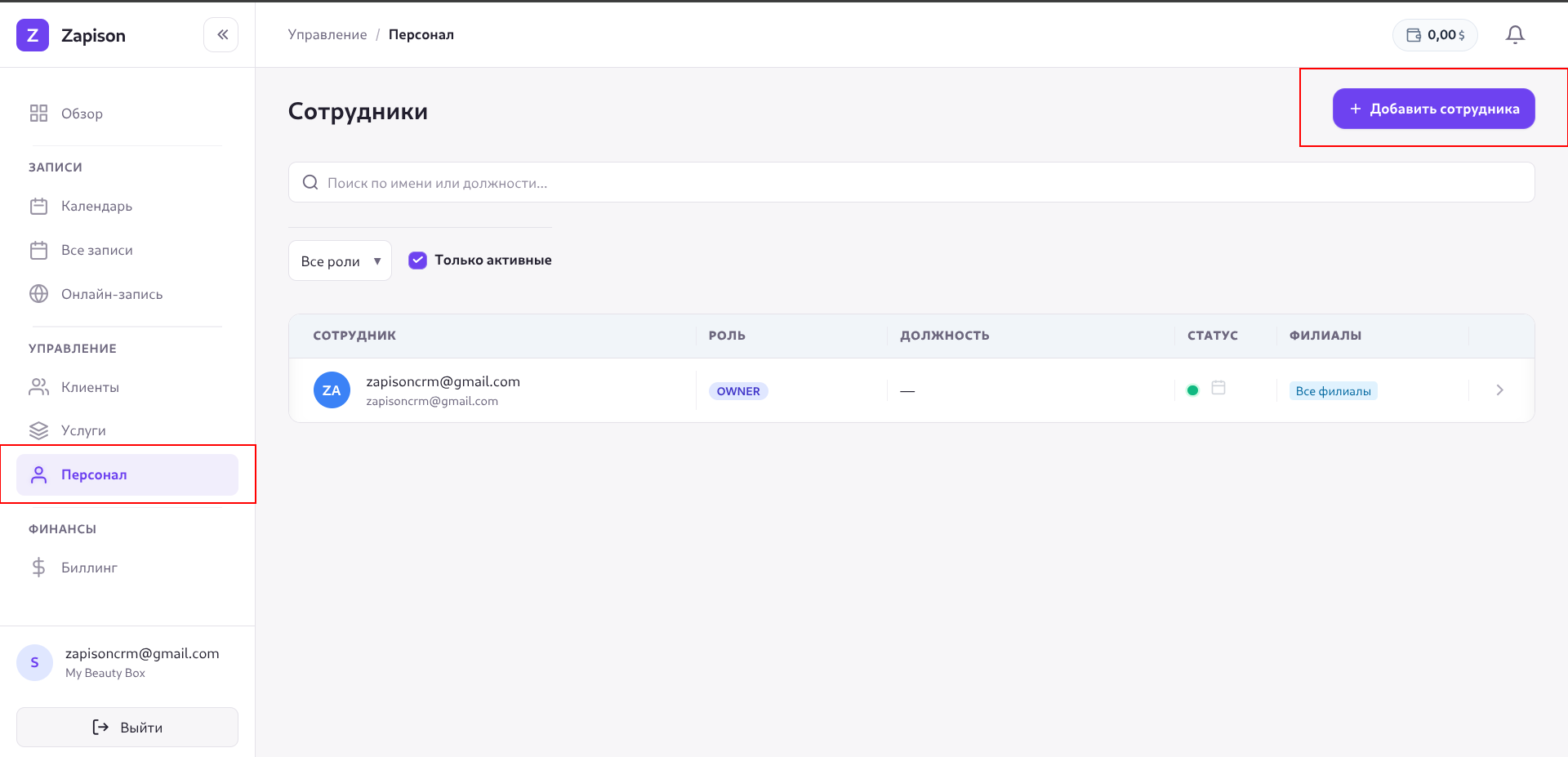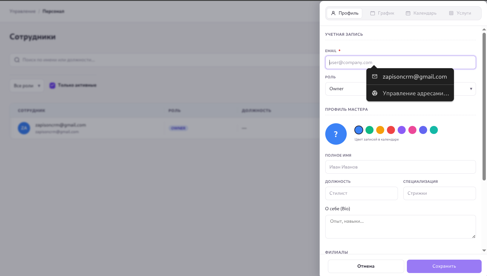 Если владелец компании тоже оказывает услуги и должен участвовать в онлайн-записи, это можно включить отдельно в карточке сотрудника.