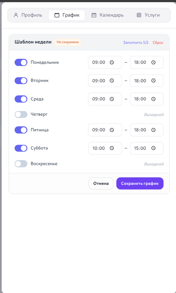 Подсказка: если вам нужно просто быстро запуститься, сначала достаточно заполнить обычный недельный график. Календарные исключения можно настроить позже.