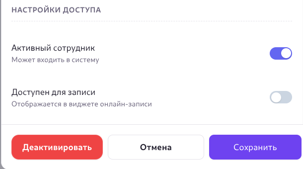 Важно: если сотрудник не доступен для записи, клиенты не смогут выбрать его при оформлении записи.