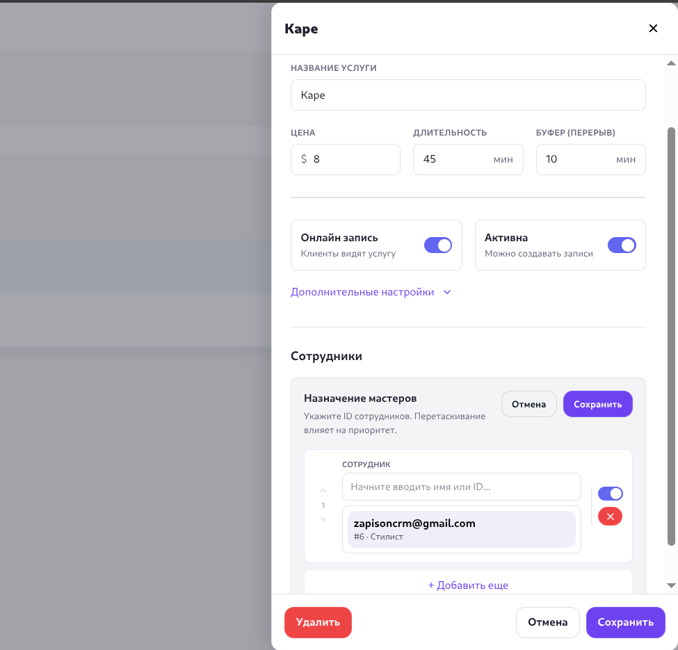 Важно: если услуга не назначена сотрудникам, это может повлиять на её доступность в записи и онлайн-записи.