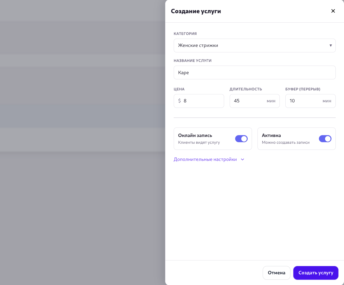 После создания услуги можно настроить её основные параметры, включить онлайн-запись и назначить сотрудников, которые будут её оказывать.
