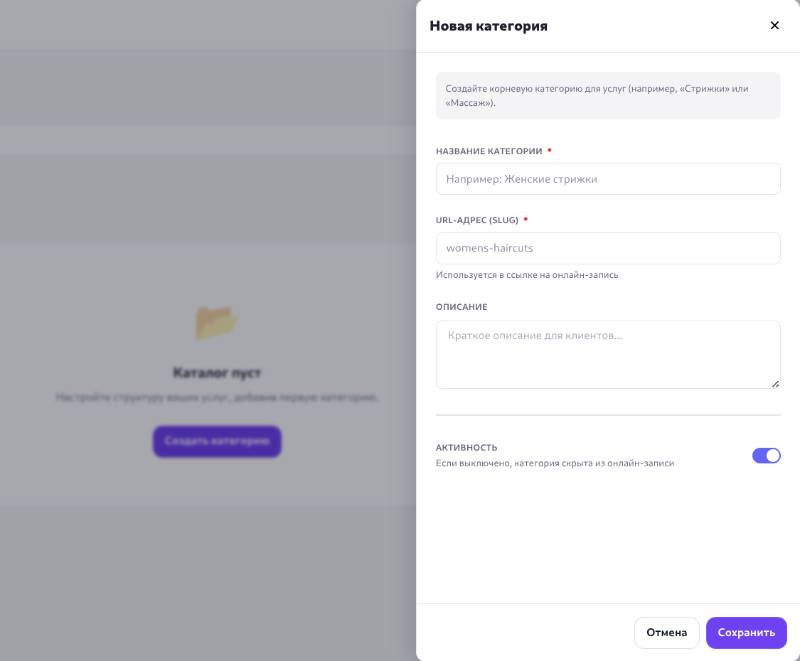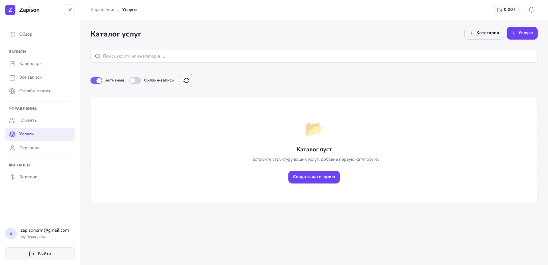 В Zapison услуги организованы через категории. Сначала вы создаёте категорию, а потом добавляете в неё конкретные услуги: например, категорию «Женские стрижки», а внутри уже услуги «Каре», «Каскад», «Укладка» и другие.