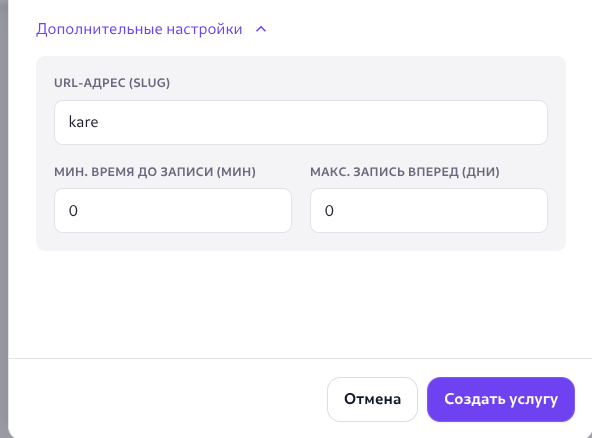Важно: если длительность или буфер указаны неверно, расписание и слоты будут отображаться неправильно.