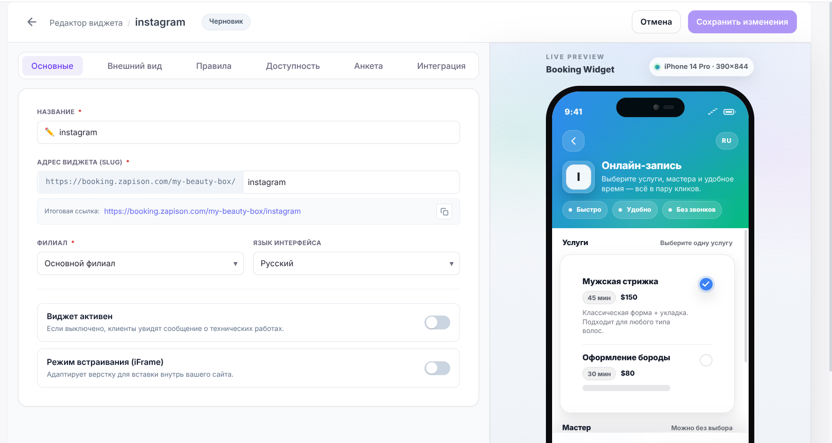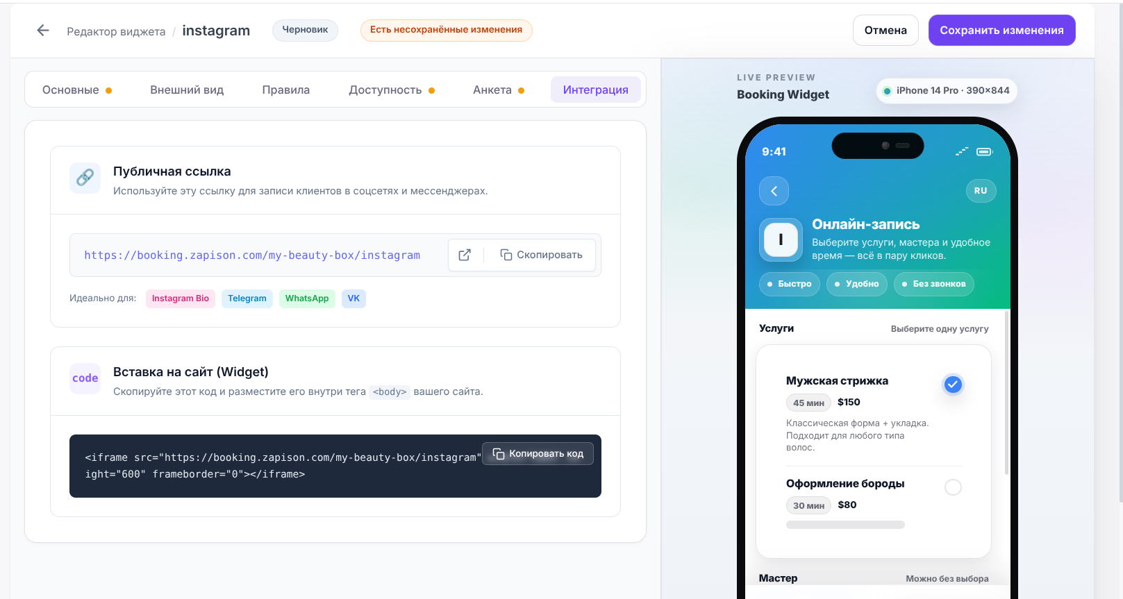 В Zapison онлайн-запись работает через виджеты бронирования.