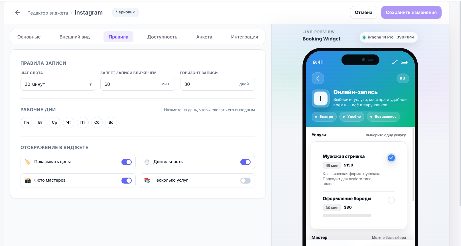 После того как вы добавили сотрудников и услуги, следующий шаг — включить онлайн-запись, чтобы клиенты могли записываться самостоятельно по ссылке или через встроенный виджет на сайте.
