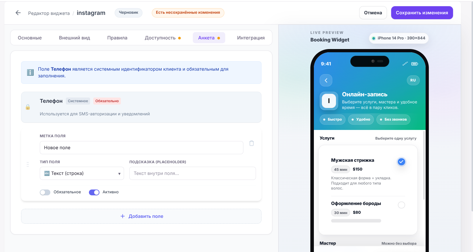 Во вкладке «Анкета» настраиваются поля, которые заполняет клиент при записи.