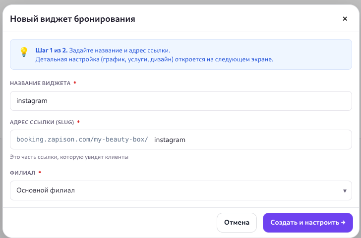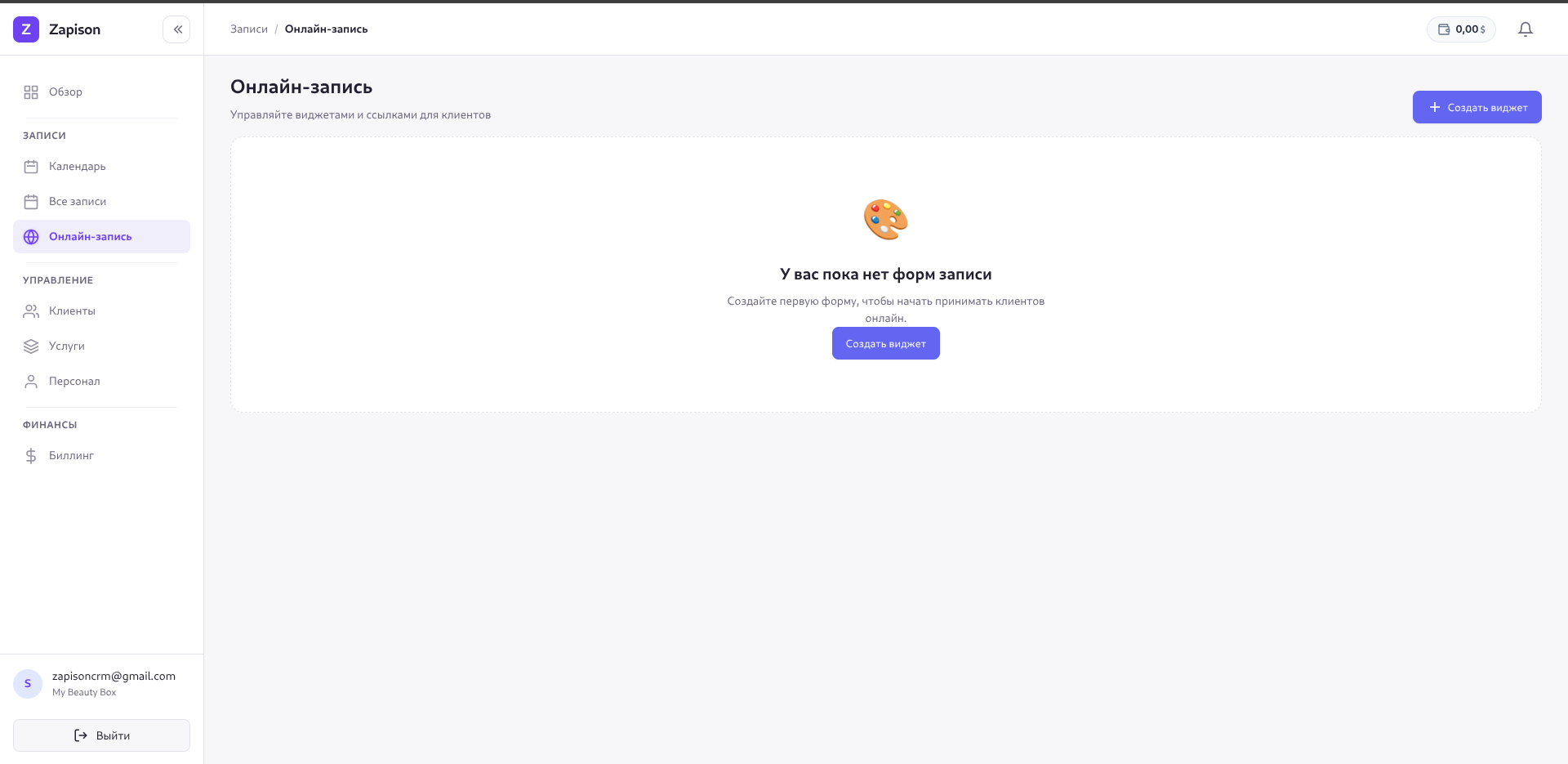Если виджетов ещё нет, Zapison предложит создать первую форму записи