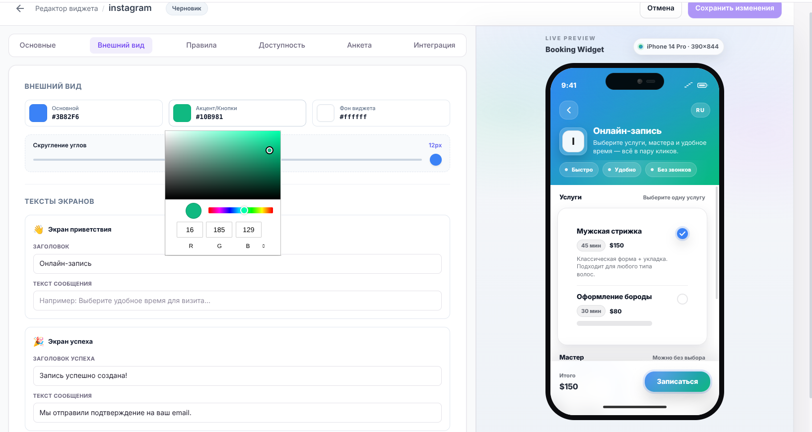 Справа при этом показывается живой preview — мобильный предварительный просмотр того, как виджет будет выглядеть для клиента.