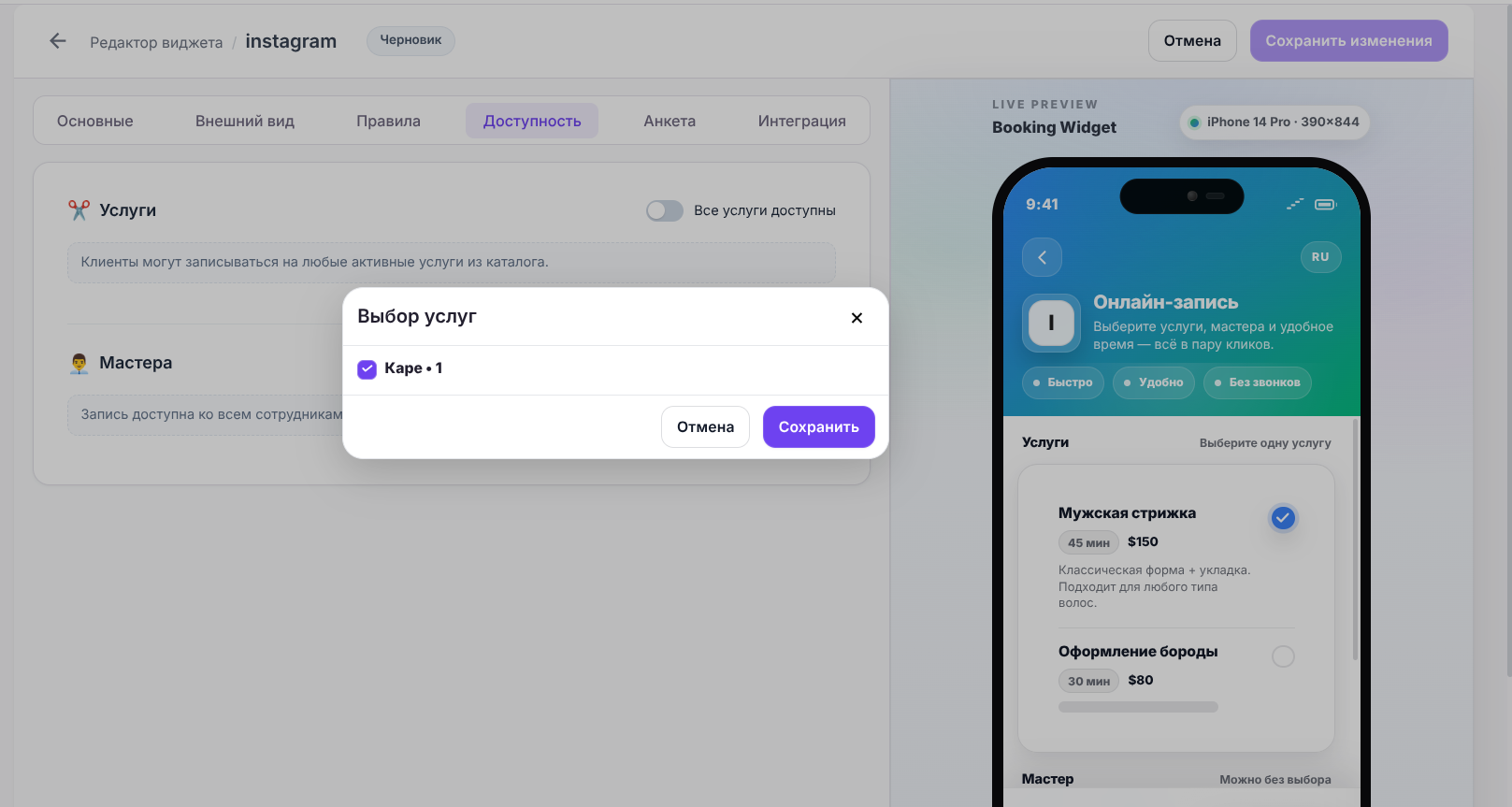 Подсказка: для первого запуска чаще всего проще оставить доступными все услуги и всех мастеров, а уже потом делать отдельные сценарии.