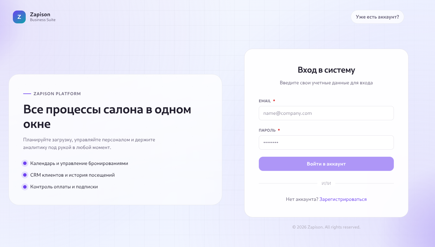 Если вы уже работали в Zapison раньше, после входа система откроет существующий кабинет.