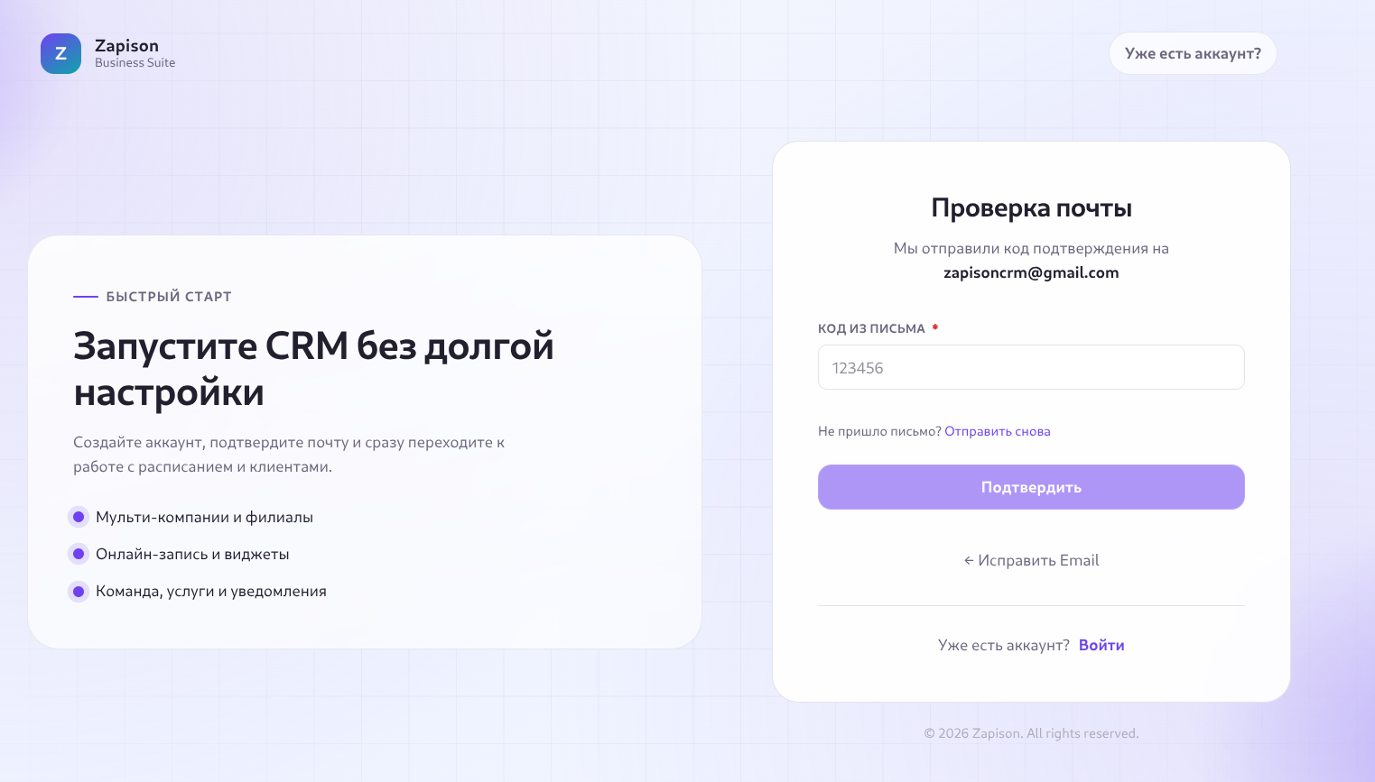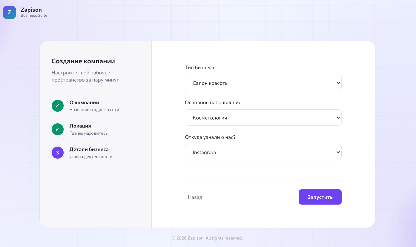 Если у вас несколько компаний, Zapison может предложить выбрать нужную.