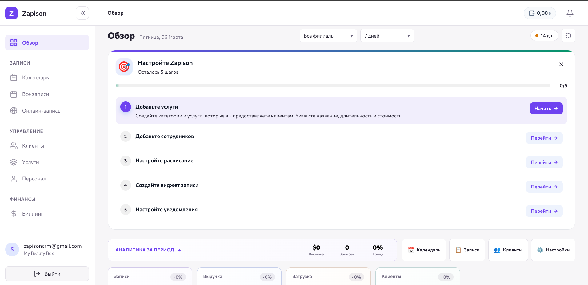 Чтобы начать работу в Zapison, сначала нужно войти в систему и создать свою первую компанию. После этого вы получите доступ к рабочему кабинету, где сможете настроить филиал, добавить сотрудников, услуги и включить онлайн-запись.