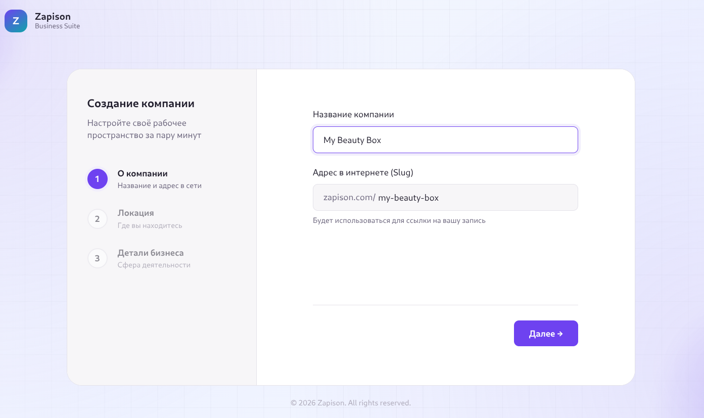 После авторизации Zapison проверит, есть ли у вас уже созданные компании. Если это первый вход, система предложит создать новую.